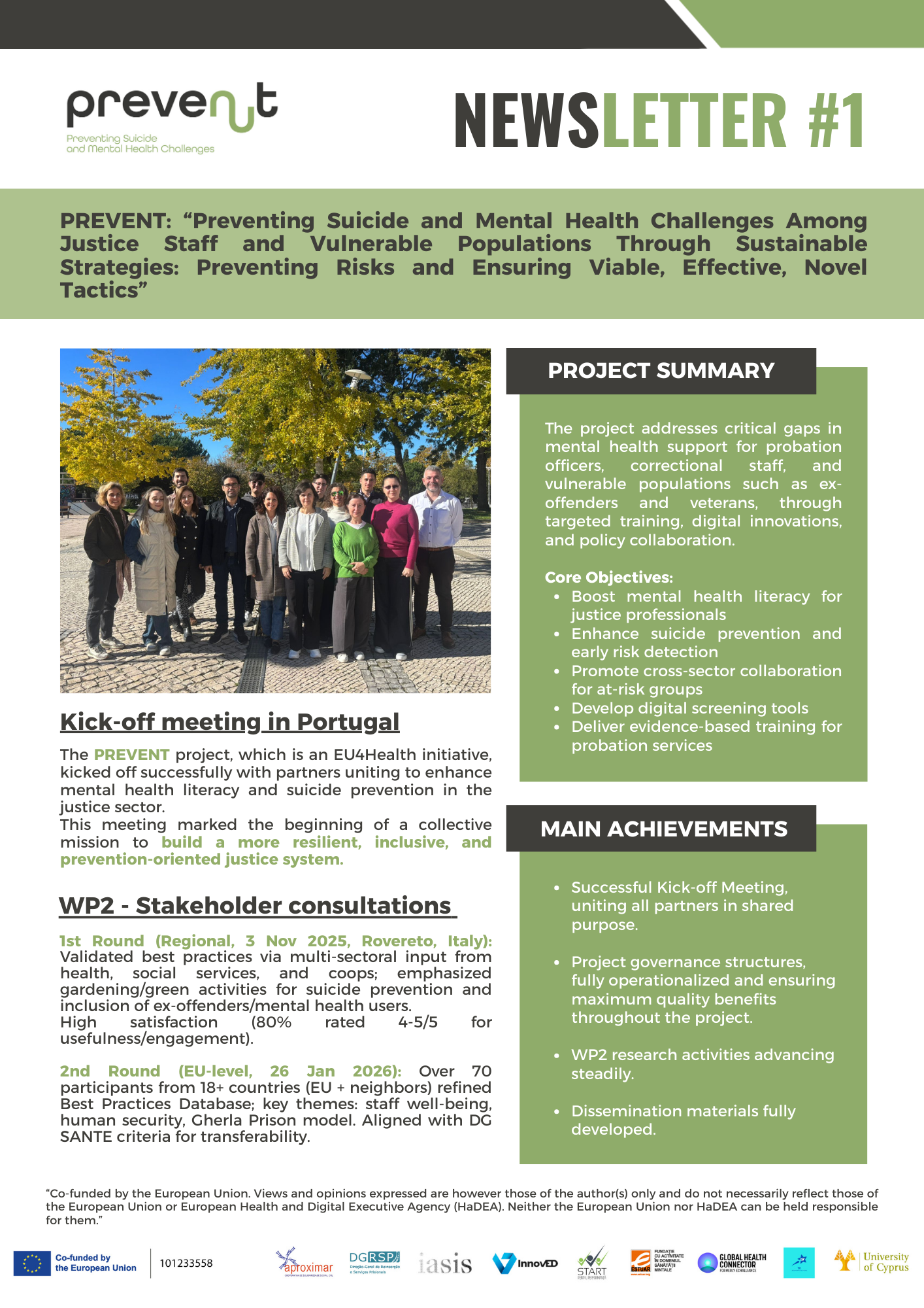 The PREVENT project represents a high level EU4Health initiative dedicated to establishing a comprehensive, prevention-oriented framework for mental health within the European justice and probation sectors. By addressing critical systemic deficiencies in suicide prevention, mental health literacy, and professional resilience, the project targets a wide array of stakeholders, including correctional staff, probation officers, and frontline community professionals who interact with vulnerable groups such as ex offenders, homeless individuals, and veterans. These populations are statistically more susceptible to mental health challenges and suicide risk, yet they frequently face a lack of coordinated cross-sector support and policy coherence.